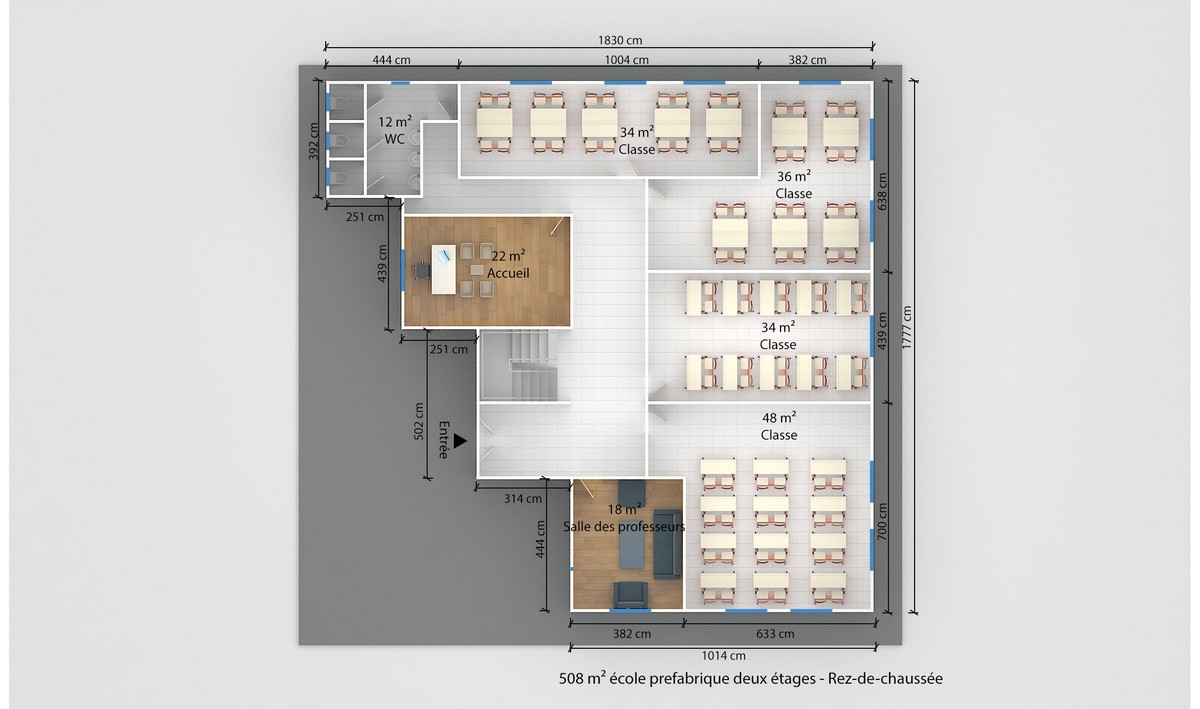Comme vous pouvez le voir, nous vous proposons un modèle de salle de classe préfabriquée imaginé par nos soins.